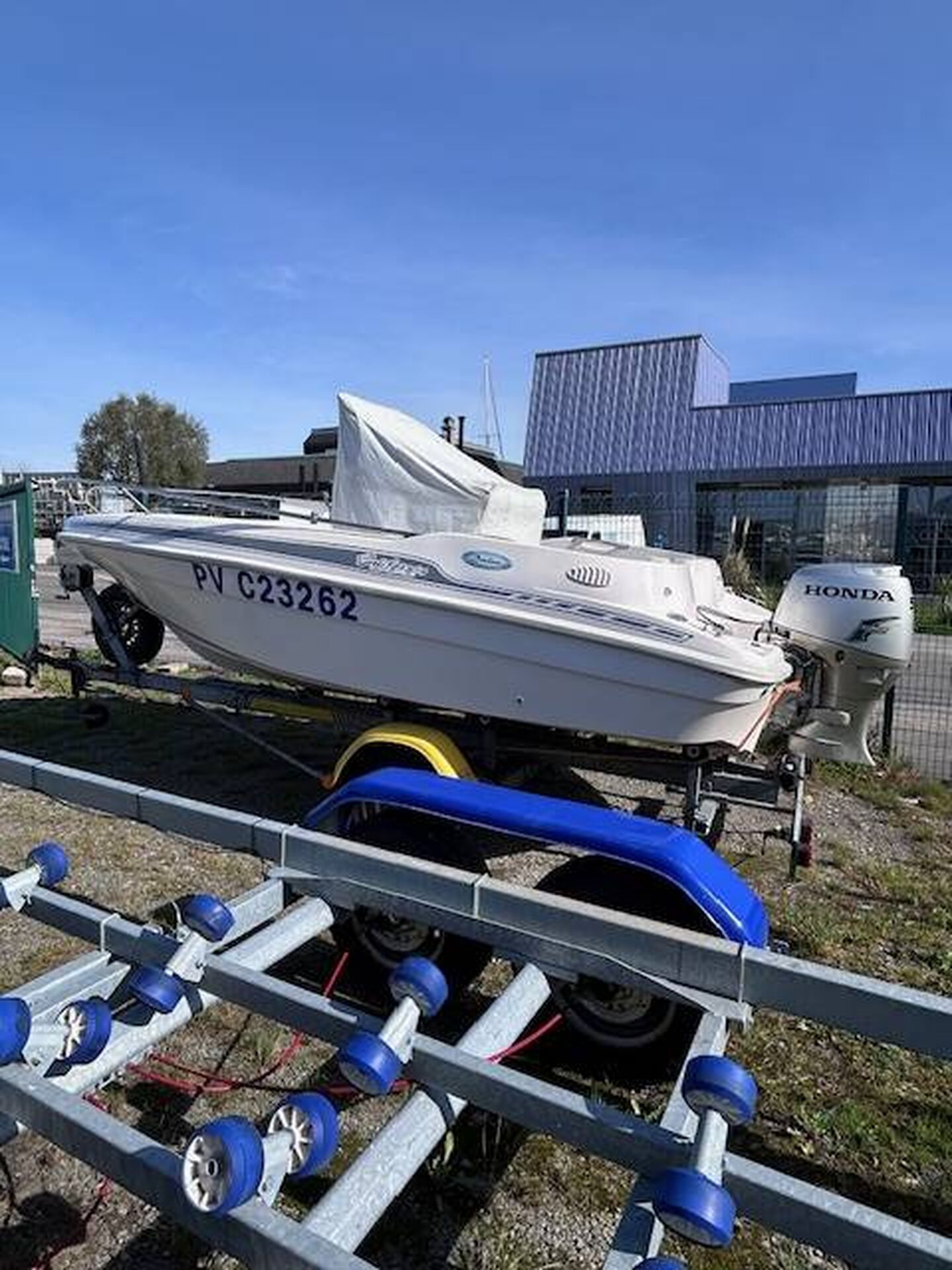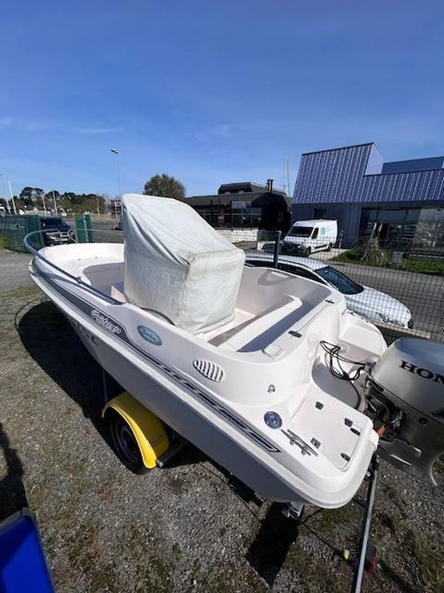 Coque Open de 5 Mètres équipée d'un moteur Honda 50 CV 4 Temps (233.5 Heures) et d'une remorque SunWay en dépôt - vente chez Meca Nautique