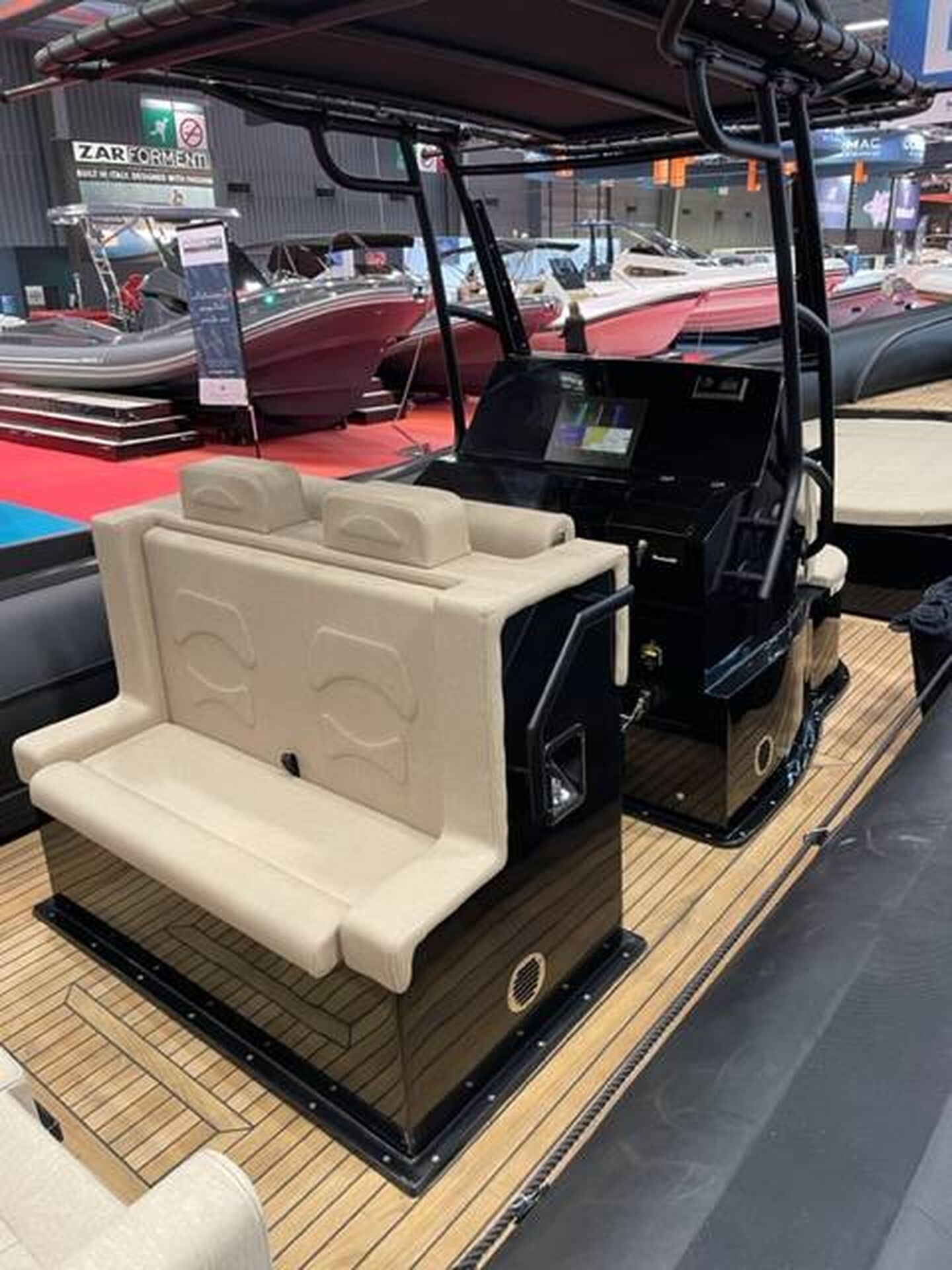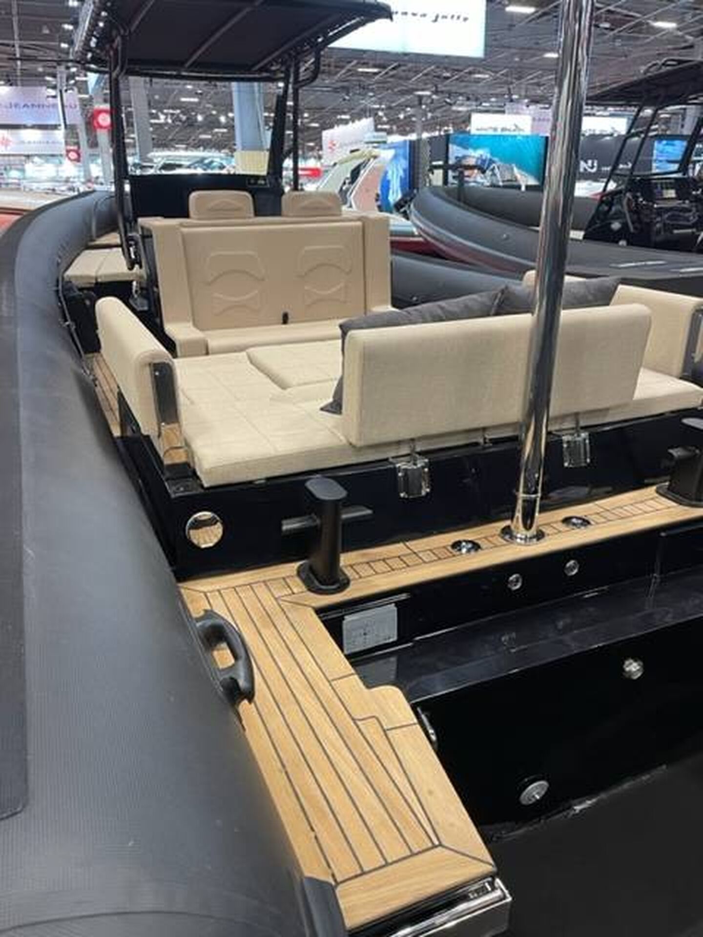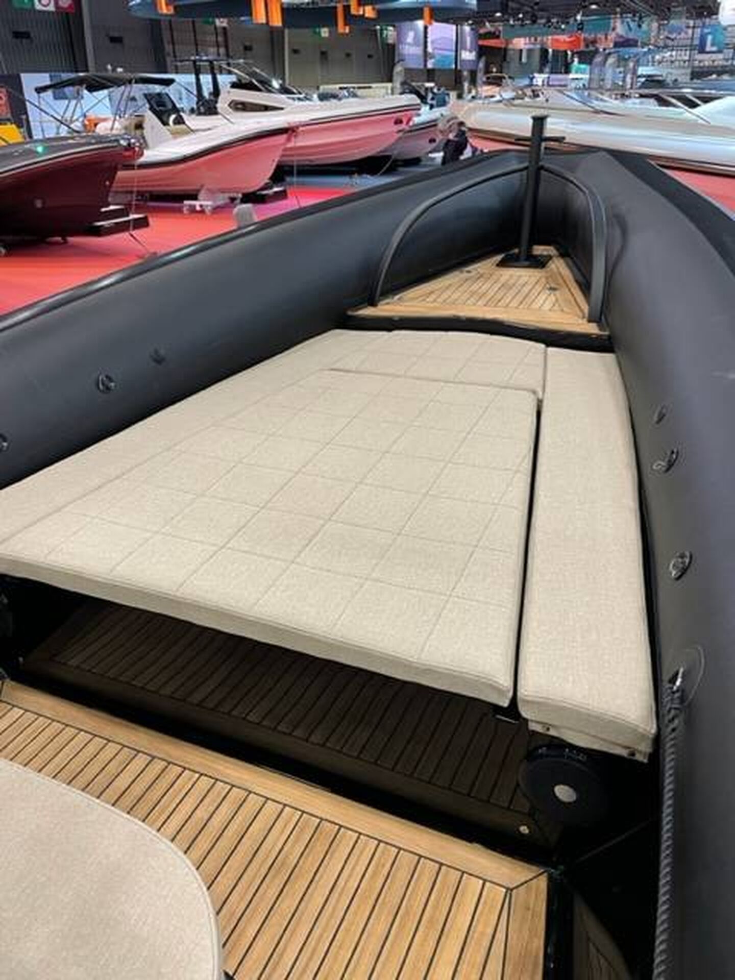 Personnalisation couleur complète du bateau, Taud de soleil avant et arrière inox et toile, Taud de mouillage, inox noir, Mat de ski inox, Pont et plage arrière en teck massif, Dossier rabattable sur le bain de soleil arrière, ...